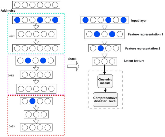 In this paper, we propose a new method for flood disaster rating assessment: the stacked denoising autoencoder clustering (SDAE-Clustering) model, which integrates a denoising autoencoder and clustering after the SDAE dimensionality reduction of the potential features to represent the original indicator data and the potential characteristics of the potential clustering in order to obtain the flood disaster rating of each region. It is used to solve the situation of facing a large amount of indicator data, and at the same time reduce the influence of correlation between indicators on the evaluation results.