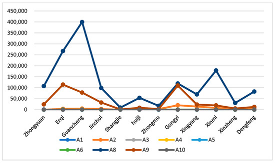 Figure 11 shows a comparison of data for each indicator in 12 districts and counties in Zhengzhou, Henan Province. Among them, the index A8 of Guancheng district is the largest, the index A9 of Gongyi City is the largest, and the indices A4 (missing persons) and A5 (mortality rate) of Xingyang City are the largest. These three areas are the most severely affected, and the grade classification is in line with the actual loss situation.