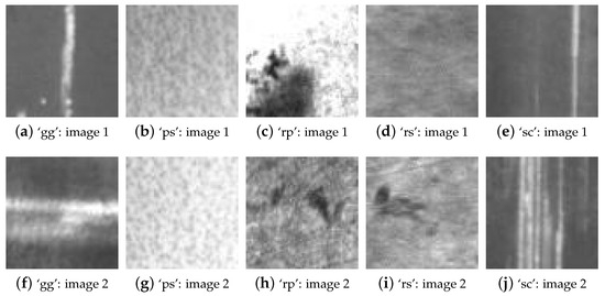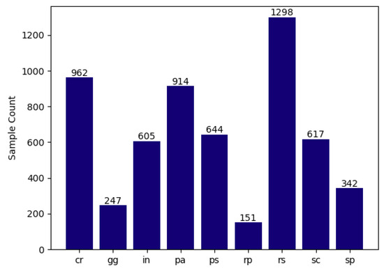 In the NEU-CLS-64 dataset, the data distribution is unbalanced. As shown in Figure 2, the data sizes of the classes ‘cr’, ‘gg’, ‘in’, ‘pa’, ‘ps’, ‘rp’, ‘rs’, ‘sc’, and ‘sp’ are 962, 247, 605, 914, 644, 151, 1298, 617, and 342, respectively. The unbalanced data distribution leads to significant misclassification, especially for the classes with a smaller data size. To deal with this problem, we generally use an oversampling method [32,33] or an undersampling method [34,35]. The oversampling method involves deleting data samples of larger classes to balance the dataset, which leads to a serious loss of useful information and weakens the generalization capacity of the model. Therefore, we turn to the oversampling method, by randomly selecting and copying data samples from smaller classes to balance the whole dataset. Since the data oversampling method introduces duplicate samples, we also use data augmentation methods (e.g., flipping up, flipping down, flipping left, flipping right, and 90-degree rotation) to avoid potential data overfitting problems and improve the generalization capacity of the SNN. In this way, we construct the training data, the unlearned data, and the test data with the data sizes of 10,384, 1298, and 1445, respectively, as listed in Table 1. The initial SNN model with a four-layer CNN architecture achieves 92% classification accuracy on the test data.