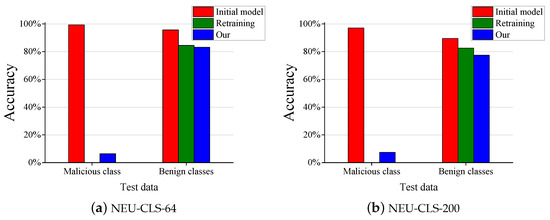 After model strengthening, malicious samples should have little or no impact on the final model. As mentioned in the previous section, we assume that all malicious samples belong to the same class (e.g., class ‘1’ in the NEU-CLS-64 dataset and class ‘2’ in the NEU-CLS-200 dataset), which is so-called the malicious class. Other classes with benign data samples are called benign classes. Table 3 and Figure 3 show the classification accuracy of our model strengthening method. For the NEU-CLS-64 dataset, the initial model provides classification accuracy of 99.31% for the malicious class and 95.65% for the benign classes. In contrast, our method gives a classification accuracy of 6.39% for the malicious class and 83.17% for the benign classes. This indicates that the malicious class is almost removed from the final model without significantly reducing the classification accuracy for the benign classes. Compared to the retraining method, which retrains the whole model after deleting all malicious data from the training data, we still have comparable classification performance (84.35% vs. 83.17%), even with an extremely fast coverage time, as shown in the next section. From the NEU-CLS-200 dataset, we can easily infer similar results with the NEU-CLS-64 dataset. In summary, the experimental results confirm the model strengthening accuracy of our method.