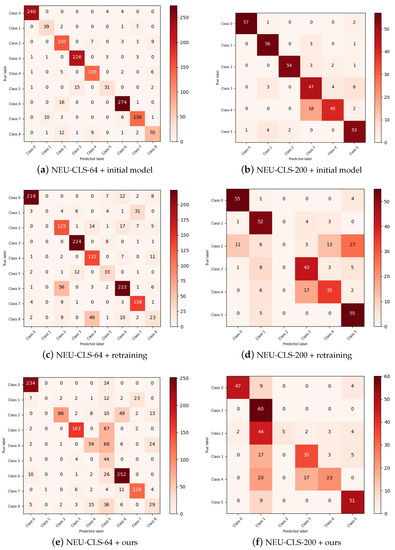 To investigate the detailed information, we also evaluate the F1-score, precision, and recall on the test data, as shown in Figure 4. Compared to the initial model, our method is not able to indicate the correct label for the malicious class (i.e., class ‘1’ in the NEU-CLS-64 dataset and class ‘2’ in the NEU-CLS-200 dataset). Thus, the malicious class is identified as other classes, confirming that our method can remove malicious data samples for model strengthening. Furthermore, our method provides good classification performance for other classes, showing that it can produce excellent results for benign data samples.