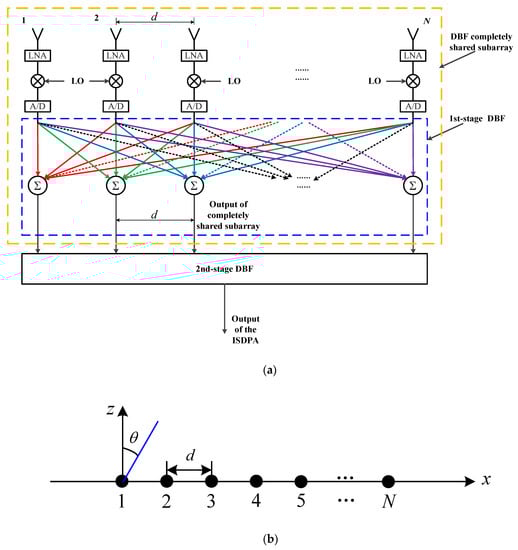 The scheme (a) and geometry (b) of ISDPA based on the DBF completely shared subarray.