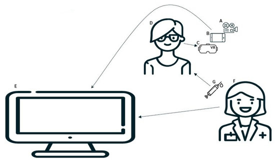 The 3D content that is displayed on the screen on the phone is simultaneously displayed on an external monitor (E) using Miracast [41]. This allows the doctor (F) to observe the progression of the VR story and perfectly time the delivery of the vaccination (G) so that it coincides with the moments in the video when the magician touches the hero’s arm.