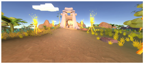 For the implementation of the VaccineHero application, the Unity game engine was utilised in combination with the C# programming language. The main scene of the 3D world (Figure 4) was populated with models from the Unity Asset Store, which were processed as needed through the Unity application to adapt to the needs of the game. The processing included the improvement of the textures and an analysis of the models, as well as the correction of compatibility problems between some of the models and the Unity application.