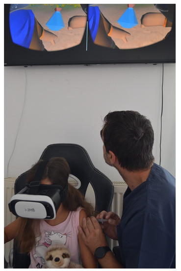 In this work, we aim to limit and, if possible, completely alleviate the discomfort experienced by children during the vaccination procedure. Other researchers have already established that the pain and fear children experience during immunisation can be affected by external factors, such as parents’ behaviour [10,11], breastfeeding (for younger children) [12,13,14], being distracted [15], receiving a massage [16], different body positions [17], sweeteners [18,19], and so on.