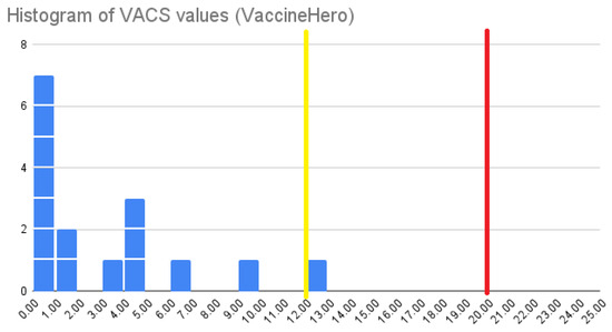 In total, 16 young patients aged 4–12 years old, with a mean age of 8.28 years, ranging from 3 years, 3 months, and 8 days old to 12 years, 9 months, and 22 days old, were vaccinated using the VaccineHero application in the period between 6 June and 4 July 2023. Of these children, 81.25% were boys and 18.75% were girls. All of them had completed the Greek-recommended vaccination schedule without any side effects or negative experiences in the past. The vaccination process took place in Greece. The VACS values were recorded for the children’s experiences, and a histogram of these values is presented in Figure 10. These parameters are similar to those of the cohort reported in [6], making the findings of the two studies directly comparable.
