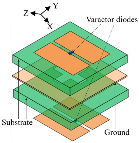Under the incidence of the Y-polarized wave, different capacitance values could be obtained by applying different reverse bias voltages to the varactors. From the perspective view from top to bottom, the RTA element is a symmetrical structure with the ground plane in the middle.