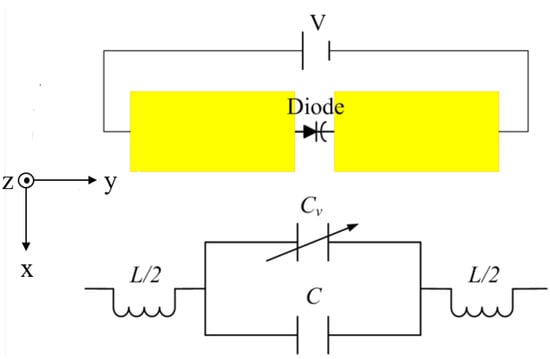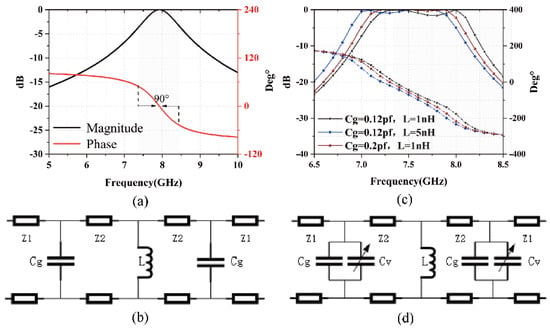 By changing the values of and , the different responses of the bandpass frequency can be obtained. In order to further verify the correctness of the circuit, the bandpass frequency response of the circuit was calculated in the ADS. As shown in Figure 2c, through an ADS simulation of the proposed circuit, the results indicate that when different values are assigned to and , the variation in the transmission phase and magnitude, with a change in these two parameters, is minimal. Thus, it can be inferred that the circuit can realize the corresponding bandpass frequency response, which can be used as the theoretical basis for the design of the RTA element. However, the reconfigurable characteristics of the RTA element need to be realized by integrating the active device. Figure 2d shows the circuit model after loading varactor diodes, whose center frequency could be tuned using the varactor. According to the equivalent circuit theory, the varactor diodes soldered on the slots of the FSS can be equivalent to the circuits in Figure 3.