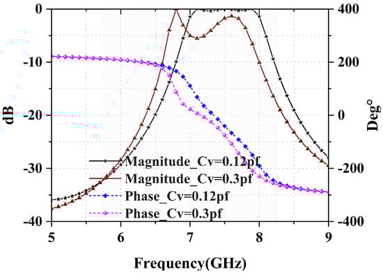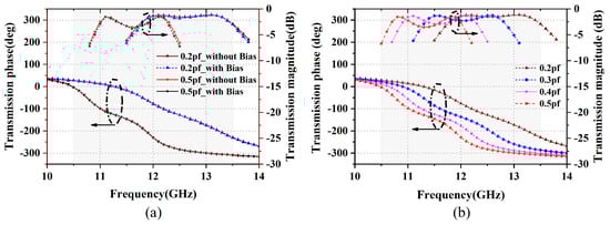 According to the analysis of a two-port microwave network, it is known that the transmission phase of a unit cell could be expressed by the phase of , i.e., of a two-port network. When the capacitor of varactor is much larger than in the circuit, then the formula could be set up, e.g., . Therefore, in order to obtain the relationship between the transmission phase and the capacitor of varactor , Equations (1)–(3) were employed for calculation. Herein, ADS is used to simulate and verify the equivalent circuit, as shown in Figure 4. It is proven that different transmission phases could be obtained by changing the values of .