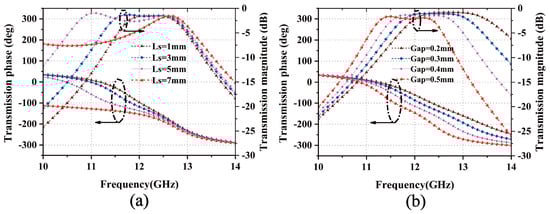 To inspect the properties of the element, numerical simulations are carried out via the commercial full-wave package (CST Studio Suite 3D 2021). Moreover, according to the filter theory, the transmission phase and magnitude are two crucial physical quantities that need to be taken into consideration, and it is clear that the transmission responses of different bandpass frequencies can be obtained by changing and , as shown in Figure 2c. Therefore, based on this circuit analysis, the RTA element is designed and optimized by adjusting the corresponding parameters and to match with the corresponding and in this circuit. The optimized simulation results of and are shown in Figure 6a and Figure 6b, respectively. In Figure 6a, as varies from 1 to 7 mm while keeping at 0.4 mm, and in Figure 6b, as varies from 0.2 to 0.5 mm while keeping at 5 mm, it can be observed that only when is equal to 5 mm and is equal to 0.4 mm that the transmittance remains within a −3 dB variation range, within the frequency range of 11.5 to 12.8 GHz, and it satisfies a phase difference. Additionally, the results show that this RTA element can realize the corresponding bandpass frequency response. Although the structures of the element could be implemented with a standard printed circuit board (PCB) technique, the most technical difficulty during the implementation of the RTA is the layout of the DC bias circuits of the varactors.