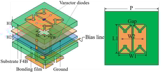 To comprehend the fundamental operational principles of an RTA and the working mechanism of its unit cell, which is equivalently modeled as a second-order LC filter circuit, a straightforward unit cell design was proposed. The configuration of an active RTA unit cell is demonstrated in Figure 1, which is composed of two F4BTME265 substrates (, tan = 0.0015) and three metallic sheets. The metal patches on the upper and lower surfaces are the radiant elements with one rectangular slot between two patches on the substrates. The middle ground sheet with the cruciform slot is constructed for the phase shift characteristics of the frequency selective surface. Two varactor diodes are loaded between the rectangular patches on the top and bottom.