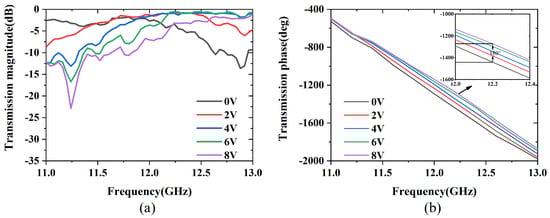 Under the free-space measurement, the transmission characteristics of the fabricated RTA is experimentally tested. The RTA is fabricated with the low-cost printed circuit board (PCB) technology. Furthermore, this RTA’s measurements are conducted in a microwave anechoic chamber, utilizing a standard horn antenna as the feeding source, which is positioned at a distance of 135 mm from the transmission array surface, with a focal length-to-diameter ratio (F/D) of 0.7. Simultaneously, an ultra-wideband horn antenna is employed as the receiving antenna for far-field radiation pattern testing. During the testing process, a control circuit is employed to apply varying voltages to the varactor diodes, effectively mimicking different values used in simulation. The measured results are illustrated in Figure 10. It can be observed that when the DC voltage is increased from 0 V to 8 V, the operating frequency of the passband moves from 11.4 to 13 GHz, and the corresponding range of phase tunability is about at 12.2 GHz. When comparing the simulated results in Figure 8b, as is tuned from 0.2 to 0.5 pf, the operational center frequency of the passband shifts from 11.5 to 12.8 GHz, and the corresponding phase compensation range is up to at 12.2 GHz. It is seen that the measured results coincide with the simulated ones, but there are still some deviations of the operating passband frequencies, which is probably caused by the fabricated errors, soldering problem of the large amount of varactor diodes, and so on. Furthermore, according to the literature [14], this type of varactor diodes is reported to work in C-band, but a not in band. Thus, the parameters of lumped RLC in equivalent circuit are not fully accurate, which is the main reason for the deviation of the operating frequencies. Also, due to the insertion loss of the active devices, the transmission loss is slightly larger than the simulated one.