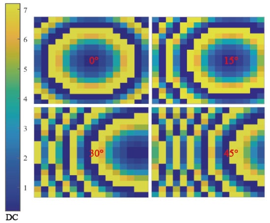 According to the transmission characteristics in Figure 10, the distribution of the voltages of DC bias for the RTAs operating at 12.2 GHz is illustrated in Figure 11. The reverse in bias voltage from 0 V to 7.2 V ensures that the transmission magnitude is maintained at about 3 dB and the corresponding phase tunability is about . By directly controlling the DAC via the MCU, the fast beam-forming process could be flexibly manipulated.