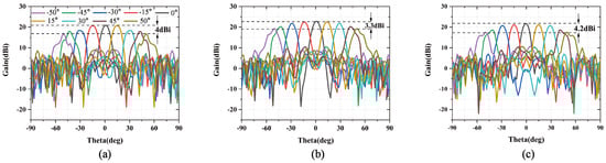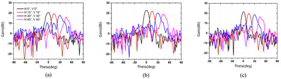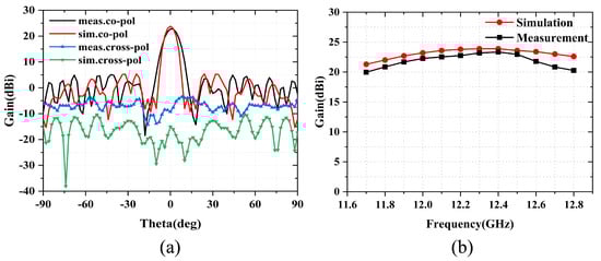 Figure 12 shows the measured steering beams at 11.8–12.6 GHz. It can be seen that the RTA could well achieve 2D beam steering from to , and the radiation pattern could remain stable at the whole operating bandwidth. As illustrated in Figure 12b, at 12.2 GHz, the scanning gain loss is within the 3.3 dBi value range, which is close to the simulated ones. Furthermore, the proposed RTA exhibits a low sidelobe level of −17.8 dB, as demonstrated in Table 1. Furthermore, Figure 13 shows the measured beams steered in both horizontal and vertical planes at 11.8, 12.2, and 12.6 GHz, respectively. Figure 14a depicts the radiation patterns of main beam co-polarization and cross-polarization at 12.2 GHz. It can be seen that the cross-polarization performance of the proposed RTA is satisfied with a difference of about 28 dB, between main beam co- and cross-polarization patterns. The maximum gain of the measured main pattern is about 22.76 dBi in Figure 14b, and the corresponding aperture efficiency is 24.65%. The calculation formula of aperture efficiency is as follows: