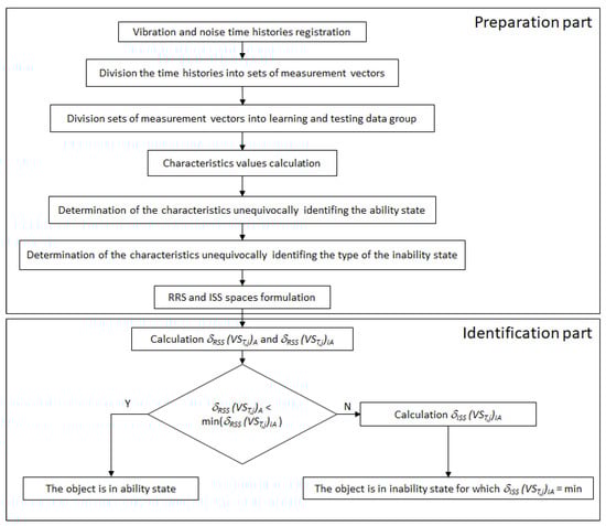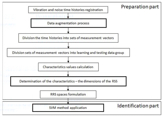 In order to increase the method efficiency and robustness, the preparation phase was extended by a data augmentation process. Additionally, selection of the characteristics—the dimensions of the reliability (RSS) and inability (ISS) states spaces—was accomplished by correlation analysis between all characteristics using the Pearson correlation coefficient. The identification phase of the procedure was also modified. In the new variant, identification was performed using the SVM method. The structure of the new identification procedure is presented in Figure 2.