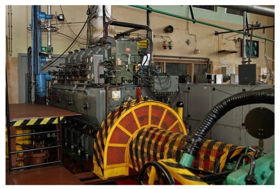 The engine under testing was equipped with a Woodward PGA-type multi-scope rotational speed controller. Thus, the rotational speed could vary in the range of 700–1200 rpm. The AL20 series engines can be fired by heavy fuel oil (HFO), marine diesel oil (DMO), or gas. The diameter of the cylinder was 200 mm, the stroke was 300 mm, and the nominal value of the valve clearances was 0.4 mm (Figure 5). The basic engine specifications are presented in Table 1.