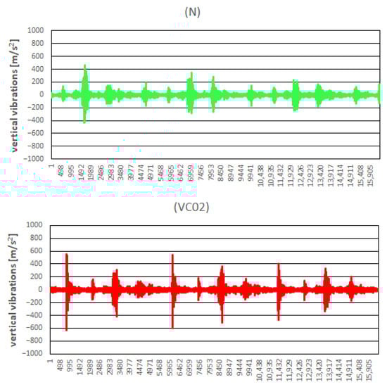 In Figure 7, one of the 18 signals (vertical vibrations for cylinder 1) of the exemplary set of measurement vectors is presented for the ability (N) and selected inability (VC02) states. In this way, 28 sets for states N, VC02, and VC08; 29 sets for state CLE; 26 sets for state INJ; and 13 sets for the PUMP state were obtained. From a machine learning perspective, each set of measurement vectors is a labeled sample.