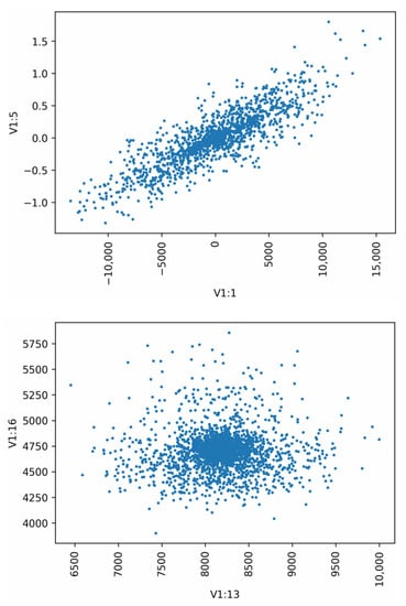 V1:5 = f(V1:1)—the exemplary strongly correlated characteristics (rV1:5,V1:1 = 0.85), V1:13 = f(V1:16)—the exemplary weakly correlated characteristics (rV1:13,V1:16 = 0.026).