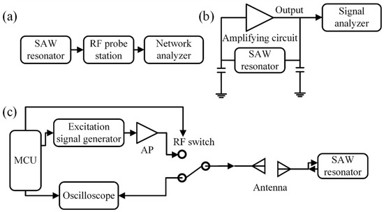 In this work, the temperature sensing characteristics of AlN/ScAlN composite thin film SAW are investigated using three different measurement methods. As shown in Figure 1a, the direct measurement method measures the frequency response of SAW devices at different temperatures through a network analyzer. This method can accurately and intuitively measure the law of sensor resonance frequency changing with temperature. As shown in Figure 1b, the wired measurement method uses an oscillating circuit to connect a resonator, and obtains a frequency change curve by reading the oscillating signal. As shown in Figure 1c, the wireless measurement method is able to connect the resonator to the antenna, and collect the response of the resonator to the excitation signal at different temperatures.