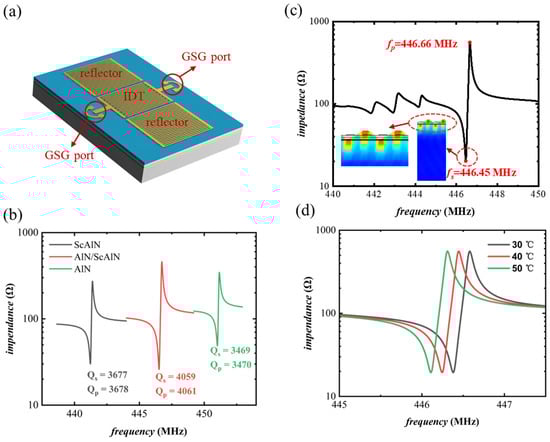 First, a resonant SAW resonator with an interdigital transducer (IDT) and reflectors was designed, as is shown in Figure 2a. The finite element method (FEM) method was used to obtain the frequency response by COMSOL multiphysics. The simulated impedance curve of the SAW resonator is shown in Figure 2b. In the model, the number of IDTs was 50. In order to reflect sound waves more effectively, the number of reflection grids must usually be very high [23,24]. In this work, the number of reflection grids was set to 368. Figure 2b is a comparison of Q values of 1 μm-thick pure AlN, 1 μm-thick pure ScAlN, and 0.5 μm-AlN/0.5 μm-ScAlN composite thin-film SAW resonators using COMSOL simulation with the same losses. From the results, it can be seen that the Q of the SAW resonator of the composite film was higher both in series resonance frequency (fs) and parallel resonance frequency (fp). Therefore, AlN/ScAlN piezoelectric film with a high Q value was selected. As Figure 2c shows, the simulated fs and fp values of the AlN/ScAlN composite thin film SAW resonator were 446.45 MHz and 446.66 MHz, respectively. It can be seen that there were spurious modes appearing at frequencies less than fs, but in this work the sensor worked near fs, so these spurious modes did not affect the operation of the sensor. Figure 2c also shows the surface displacement of the device at fs of the resonator, and the vibration mode was the Rayleigh mode. Figure 2d is the simulated frequency variation of the AlN/ScAlN thin-film SAW resonator at three temperatures of 30 °C, 40 °C, and 50 °C. As the temperature increased, the fs and fp values of the resonator showed a decreasing trend.