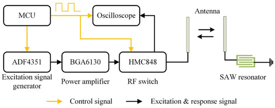 Generally, a wireless SAW sensor system includes a radio request unit and one or more wireless SAW sensor units [28]. For this paper, the designed radio request unit consisted of a excitation signal generator, a power amplifier, a radio frequency switch, and a microcontroller chip (MCU). During circuit design, the operating frequency range of the entire system should be able to contain the operating frequency of the SAW resonator. Since a radio frequency switch is used to control reception and transmission, there should be a sufficiently high isolation between the reception and transmission of the radio frequency switch. In order to simplify the circuit power supply structure, all chips used in the circuit must be powered by a unified voltage. Based on the above conditions, the system circuit design in this paper is shown in Figure 5.