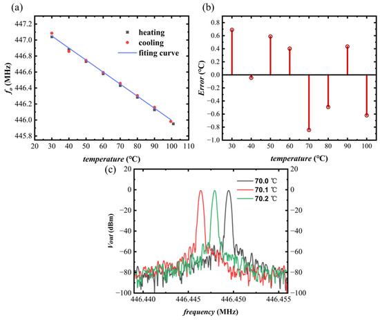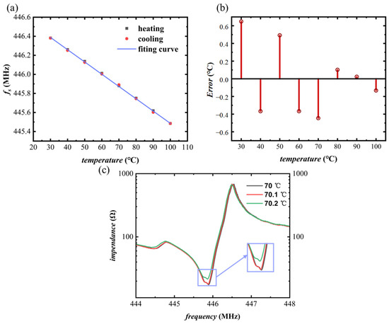 (a) Scatter diagrams and fitting curves of the relationship between frequency and temperature measured by direct measurement method, (b) measured temperature accuracy of measurement by network analyzer, and (c) the test curve of the sensor resolution, showing the fs values at the three temperatures of 70 °C, 70.1 °C, and 70.2 °C were 446.873 MHz, 446.874 MHz, and 446.875 MHz, respectively.