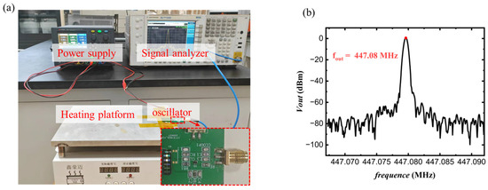 The actual oscillating circuit test system is shown in Figure 8a, and an enlarged view of the fabricated circuit board is also shown in the figure. The AlN/ScAlN thin-film SAW resonator was connected with the circuit board through the gold wire. The oscillator was attached to the heating platform of the heating plate, and the temperature change was controlled by the heating plate. The oscillator was connected to a signal analyzer, and the spectrum at different temperatures was recorded by signal analyzer. The temperature was measured with a high-precision thermocouple. The output spectrum of the oscillation circuit at room temperature measured by Kesight N9200A signal analyzer is shown in Figure 8b and the output frequency was 447.08 MHz.