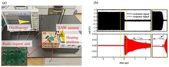 As shown in Figure 10a, the wireless SAW sensor temperature test was also performed on a heating plate. The results shown in Figure 10b were obtained through two measurements. First, without connecting the antenna, a sample excitation signal was sent through an oscilloscope at the antenna interface, using the falling edge of the control signal of the RF switch as the trigger condition. Then, the response signal was sampled through an oscilloscope at the response signal output interface, and the falling edge of the control signal of the radio frequency switch was also used as the trigger condition. In this way, the sampled excitation signal and response signal had the same time base. In the results shown in Figure 10b, before 0 μs, mainly an excitation signal was generated by the signal generator; the 0 μs signal generator stopped, and the SAW resonator generated a response signal. The time from the stop of the exciting radio signal to the direct response of the wireless sensor was about 78 ns and valid signal duration was 5 μs.