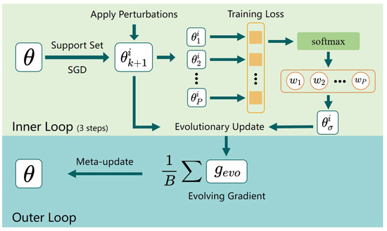An overview of our Evolving MAML approach. Our method is based on a bi-level loop. In the inner loop, the model undergoes three steps of SGD followed by the application of perturbations, resulting in P perturbed models. Subsequently, an evolutionary update is performed to obtain an evolutionary model denoted as and the evolving gradient is computed. The yellow box in the figure indicates the training loss of the corresponding model. The outer loop is responsible for learning the evolutionary gradient across tasks, which enables the redirection of learning in the inner loop.
