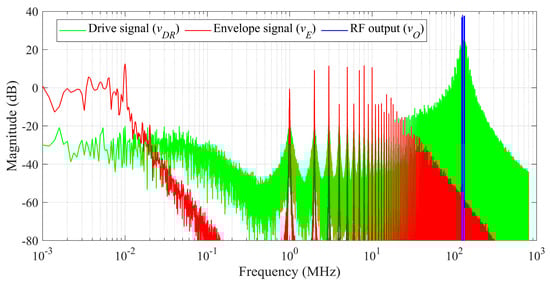 Power spectral density (PSD) of the 4C-CH VDL-T signal generated by MATLAB. Main signals in a polar-mode transmitter: drive signal (vDR), amplified envelope (vE), and amplified RF signal at the output (vO).