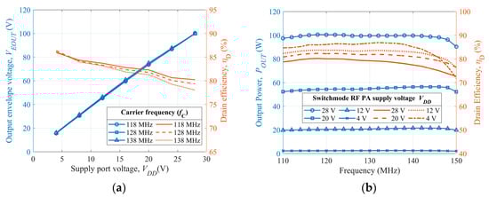 Simulation results of the class-D PA (IDQ = 2 A and PIN = 1 W): (a) output envelope voltage and drain efficiency as a function of supply voltage and (b) output power flatness and drain efficiency performance in the operating frequency band.