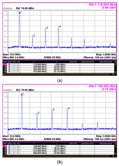 Measured harmonic rejection of the class-D PA at 100 W output power (VDD = 28 V, IDQ = 2 A, and PIN = 1 W): (a) 118 MHz CW carrier and (b) 138 MHz CW carrier.
