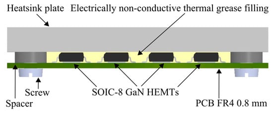 Assembly diagram for heat-sinking SOIC-8 GaN HEMTs through their packages.