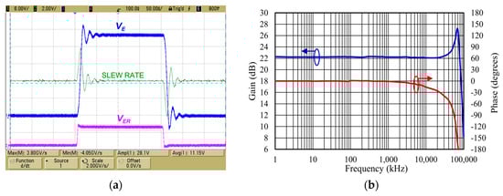 Measured performance of the linear GaN HEMT based WLEA for a paralleled 6.8 Ω and 470 pF load: (a) output slew rate for a 200 ns pulse and (b) gain and phase frequency response. The red and blue circles and arrows indicate the y-axis to which the represented data belongs.