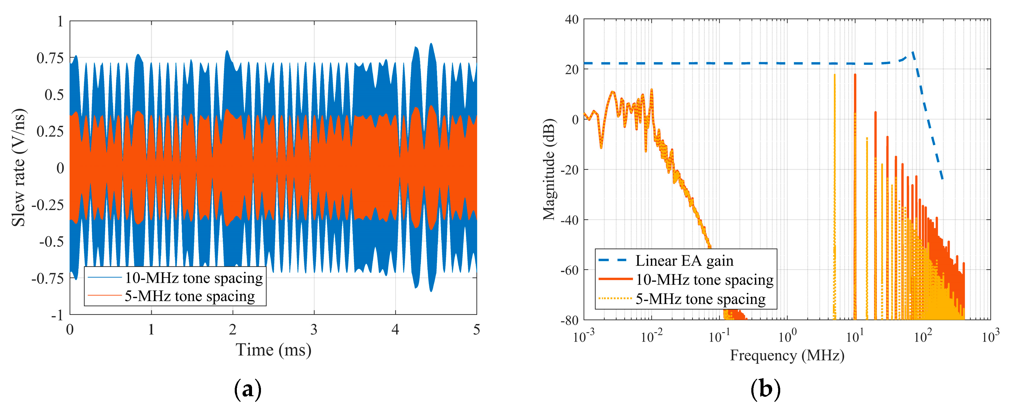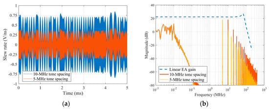 Dynamic demands of the envelope of a 2C-CH VDL-T signal: (a) time-domain slew rate envelope requirements and (b) distribution of envelope frequency components compared with the gain of the linear EA.