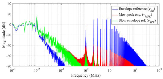 The WLEA presents good stability in frequency and draws good linearity figures. However, polar transmission techniques are supposed to improve the power efficiency of conventional RF PAs, and a linear amplifier may not be competitive to provide an improvement in these terms. To improve the efficiency of high-dynamic-performance linear regulators, several solutions (most of them based on a series combination because parallel topologies usually require a push–pull linear PA) have already been proposed for many years (slow ET, multilevel-based supply class-G PAs), and the common idea of all of them is usually to use a power supply that, in combination with the WLEA, is able to provide a variable voltage that tracks the amplified waveform [34,35,36,37,38]. As the WLEA is responsible for dynamic performance and linearity, the voltage tracking power supply does not have such stringent linearity and voltage ripple requirements, making it easy to implement, so conventional high-efficiency power conversion methods can be easily applied. For the generation of the slow envelope signal, there are several solutions described in the literature [39,40,41] that allow for real-time processing. However, in this case, we have used a method that allows this signal to be easily implemented in MATLAB. This process required two steps: The first one generated a signal called moving peak, vEMP, by using the movmax(A,k) MATLAB function over the envelope reference (vER) signal, with a sample frequency of fS = 800 MHz, using a number of points for the sliding window of k = 1000. The resulting signal was then passed through a moving mean filter function, movmean(A,k), to obtain a smoothing slow envelope reference (vSER) signal (with k = 1000) from which the digital pulse-width modulation (DPWM) control signal (vPWM) was generated, downsampled, and transferred to the arbitrary waveform generator (Agilent 81150A). Figure 12 shows the transformation of the envelope spectrum of a 4C-CH VDL-T (located at 120 MHz, 123 MHz, 128 MHz, and 130 MHz) signal through this process.