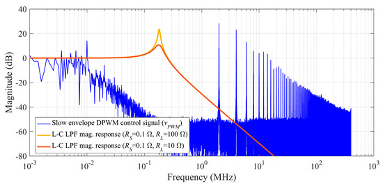 SEPS slow envelope DPWM (vPWM) control signal spectra for the envelope of the 4C-CH VDL-T signal together with the frequency response of the SEPS low-pass filter magnitude.