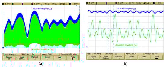 Time-domain measurements of an amplified 95 W peak output power 4C-CH VDL-T signal (located at 120 MHz, 123 MHz, 128 MHz, and 130 MHz) at the output of the polar-mode PA (RF PA IDQ = 2 A; main supply voltage, VS = 34 V): (a) envelope (vSE, vE) and RF (vO) output waveforms; and (b) detail of the amplified envelope (vE) and RF (vO) output waveforms.
