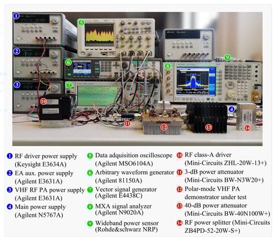 The demonstrator for the VHF HCVS class-D PA operating in polar mode in combination with the proposed EA was tested for wide fractional bandwidth multicarrier analog and digitally modulated signals, yielding good linearity and power efficiency figures. This shows that the proposed idea of using a GaN-based HCVS class-D topology for RF PA design is a feasible way to mitigate the nonlinearity issues concerning these polar-mode PA architectures when high-performance EAs (also built with GaN devices) are used for modulating its power supply port. Furthermore, these results show that the proposed system did not require the use of DPD techniques, as other PA architectures (e.g., Doherty PAs) usually do, considering the overall power efficiency and the demanding linearity nature of the modulated multicarrier signal envelope.