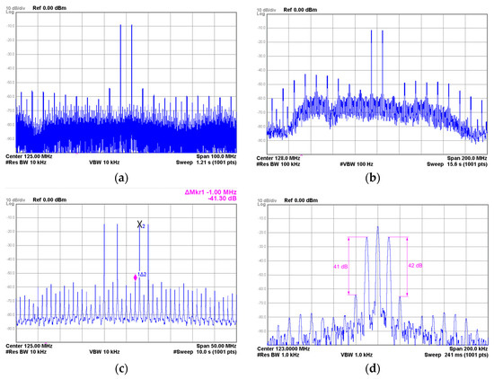 In the first case, the results shown in Figure 17a correspond to the 2C-CH AM-T signal with a carrier spacing of 5 MHz (at 125 MHz center frequency). In the second test, the carriers of the 2C-CH AM-T signal were separated up to 10 MHz to determine the limits of the demonstrator, as shown in Figure 17b. The AM test ends with a 4C-CH AM-T signal (located at 120 MHz, 123 MHz, 128 MHz, and 130 MHz), which can be seen in Figure 17c. This test covers a total bandwidth of 10 MHz, with more than 40 dB of attenuation for the unwanted spectral components, and presents good linearity figures for each individual channel, as seen in the detail of one of the channels shown in Figure 17d. The main supply voltage used to take these measurements was VS = 34 V, the peak output power reached POUT = 94 W PEP, and the resulting overall power efficiency was ηO = 47%. This can be considered a satisfactory figure considering that the signal used in the test has a PAPR = 6.5 dB and taking into account the PSD of the signal envelope.