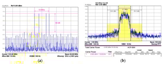 Spectral measurements of an amplified 95 W peak output power 4C-CH VDL-T signal (located at 120 MHz, 123 MHz, 128 MHz, and 130 MHz) at the output of the polar-mode PA (RF PA IDQ = 2 A; main supply voltage, VS = 34 V): (a) IMD and spurious frequency attenuation; and (b) detail of the 130 MHz channel ACPR measurements.