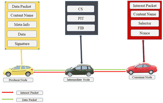 NDN is one of the five research endeavors supported by the National Science Foundation (NSF) within its future internet architecture program, encompassing the fundamental principles of information-centric networking (ICN). In 2009, VAN Jacobson initially proposed the concept of a content-centric network [9], which evolved into NDN under the NSF-funded future internet architecture project [10] as a future internet architecture [11]. NDN uses two types of packets: interest and data packets. The content consumer always initiates the interest packet to request specific data, and the data packet contains the content in response to the interest packet. As mentioned below, nodes within NDN are categorized into three categories according to the situation. (1) Content consumer node: It is a content-intensive entity that initiates communication by broadcasting an interest request for specific content. (2) Content producer node: The content producer node matches the requested content and provides it to the content consumer. (3) Intermediate node: The intermediate node in the NDN architecture serves two distinct roles based on the context of the received packet. Firstly, when the requested content name matches the available content name within the node’s storage, it functions as a content producer, directly providing the requested data to the content consumer node. Secondly, if the intermediate node does not have the requested content, it acts as a relay node, forwarding the interest packet to the next hop in the network. This dynamic behavior of intermediate nodes facilitates efficient content retrieval and distribution, contributing to the overall robustness of the NDN network.