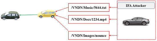 Regardless of the fact that NDN has numerous features, it is highly vulnerable to various attacks, such as interest flooding attacks (IFAs) [13], content poisoning attacks (CPAs) [14], man-in-the-middle attacks [15], and illusion attacks [16]. On top of these attacks, IFA stands out as one of the most prevalent in VNDN. The IFA is a variant of a distributed denial of service (DDoS) attack, where a content consumer initiates IFA in VNDN with a storm of non-existing interest requests. The IFA deliberately depletes resources, including PIT, CS, network bandwidth, and producer resources. This attack is executed by inundating the network with excessive interest packets. By overwhelming the system, the attacker exhausts NDN resources, rendering them inaccessible to legitimate consumers and causing disruption in the network’s operation [17]. IFA attackers can consume network resources by employing two distinct techniques: (1) a non-existing interest packet: In this approach, the attacker generates random interest packets that contain invalid requests, such as /VNDN/infotainment/music/5453.txt, where the attacker requests a text file in the music prefix. These packets refer to content that does not exist in the network. Consequently, intermediate nodes cannot resolve and retain such requests in the PIT. This results in unnecessary resource consumption and potential network congestion. Thus, PIT can be choked with forged interest packets. (2) Valid data request: The attackers target content producers with enormous legitimate interest packets using forged nounce [13]. For example, an attacker initiates an interest packet with /VNDN/infotainment/music/nounce, where nounce is a random value. Using such forged interest packets significantly impacts the producers and network routers by traversing the network resources. Figure 2 visually represents IFA in VNDN, where the attack scenario poses a significant threat to the communication infrastructure of connected intermediate vehicles using a non-existing and valid interest packet.