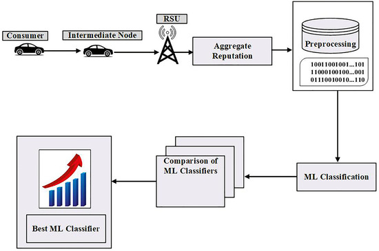 To classify content consumers as attackers or legitimate vehicles, the RSUs employ an ML algorithm to distinguish them effectively. Figure 4 depicts our network architecture, where a consumer sends an interest packet to request data from the intermediate node. Subsequently, the intermediate node sends the interest packet (satisfied or unsatisfied) to the RSU. The RSU then performs ML classification to classify content consumers as attackers or legitimate vehicles.