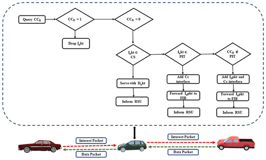 In our proposed network architecture, the intermediate node receives all interest packets, including both satisfied and unsatisfied ones. These packets are then shared with roadside units (RSUs) through a push-based beacon message dissemination system. The interaction between intermediate nodes and RSUs, particularly in terms of communication and data sharing, is elaborated below: