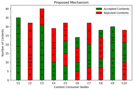 Figure 12 depicts the efficiency of our proposed IFA prevention system. In this validation scenario, both legitimate and malicious interest requests are simulated by content consumers. Leveraging the capabilities of our devised algorithm, the intermediate vehicle undertakes a pivotal role in this endeavor. A distinctive dichotomy emerges in the depicted visualizations: The algorithm adeptly identifies and rejects invalid content requests, visually represented by the prominent red indicators, while conversely accepting valid content consumers through green color. These visual representations underscore the system’s capability to discriminate between legitimate and unauthorized interest propagation, reaffirming the effectiveness of our proposed approach. In addition, we measured the efficiency of the default content acceptance at an intermediate node, as shown in Figure 13, where an intermediate node accepted every interest packet without considering the reputation of the content producer.