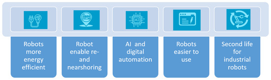 It is also worth mentioning that despite the general public’s (and official bodies as well) increasing support for sustainability in the development of robotic applications with regulations [26,27], the appropriate guidelines for streamlined implementations are still missing [28].