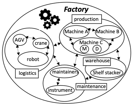 The holonic production system (Figure 3) is based on the concept of the holonic system defined by Arthur Koestler [44]. In the holonic production system, holons are considered operators of control processes, acting autonomously. Koestler emphasizes autonomy, which determines to what extent the system is intelligent and to what extent the system can react to faults and resolve them independently without the intervention of a superior holon. At the same time, however, such holons can be controlled and managed by higher-level holons. Thus, an intelligent manufacturing system can be thought of in holonic terms as an entity composed of autonomous modules (holons) with distributed control.