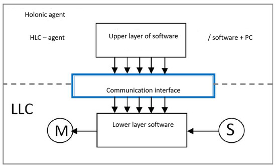 As can be seen in Figure 4, it is a loose coupling of the upper HLC layer (agent) and the lower LLC layer (hardware—PLC, CNC, and others) together with the communication interface required for data exchange between the LLC and the HLC [50].