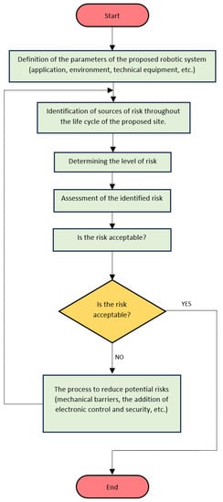 In the robotic world, a risk assessment is used to identify potential risks, with one of the next steps being to reduce them to an acceptable level. According to ISO standards, all mechanisms must undergo a risk assessment to designate a device or machine as safe. However, it is also important to note that many mechanisms are already certified directly by the manufacturer at the time of manufacture, which facilitates our risk assessment process. However, even though the components that make up a cobot or its software are certified and labelled as safe, this does not mean that the robot is safe about its environment. Especially in the case of industrial applications, it is almost impossible for robot manufacturers to declare that a cobot will be safe once incorporated into any process. It is only after the estimation and assessment of all the risks that we can determine with certainty that a robot can be declared safe. An example is the handling of a sharp object by a certified cobot. Although the robot is considered safe, the application as such is far from safe. Despite all the certificates from the cobot manufacturer, it is therefore imperative to reassess the risks and then minimize them. The algorithm (Figure 5) illustrates the process leading to a successful risk assessment along with recommendations for minimizing the risks. Some shortcomings in the current risk assessment approach were identified, and therefore, a new perspective is proposed on risk identification and risk level determination.